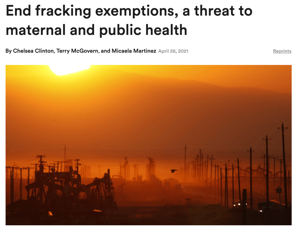Dr. Martinez worked with Terry McGovern and Chelsea Clinton to review the health threats of fracking and called for the Biden Administration to end fracking exemptions. They discuss how fracking can impact the development of the heart, reproductive system, and cardiovascular system for a fetus during pregnancy, thus: