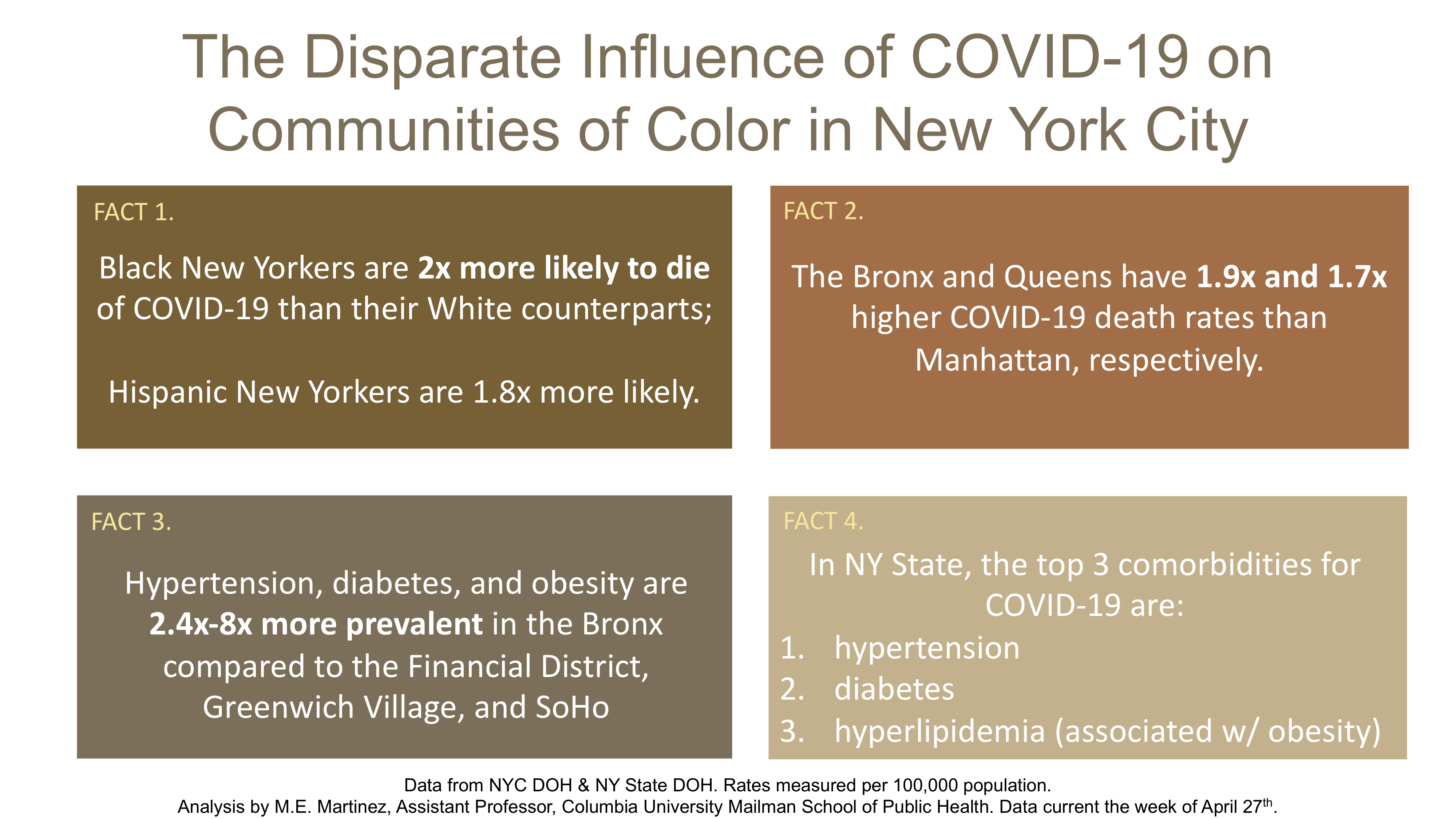 Please note on the plots below, county level cases for New York state are from the state department of health, while New York City cases are from the New York City Department of Health, depending on what time of day they post case records, there may be discrepancies between the two due to the rapid change in case confirmations. IMPORTANT NOTE: not all datasets are updated the same day. Therefore, please make note of the date of reporting/update listed at the top of each figure; because some figures will be more up-to-date than others. I will update this page and figure periodically. I have also included a select set of interviews and updates relating to our lab’s COVID work. Lastly, check here for updated on our COVID-19 publications. The Martinez Lab’s work on COVID-19 is funded by the NSF Award 2029421.
