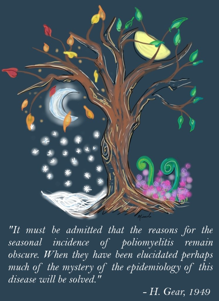 Seasonal fluctuations are a common feature of acute infectious diseases. Diseases such as polio, measles, chickenpox, rotavirus, and influenza have distinct seasonal windows during which epidemics occur. Disease seasonality is a feature that is hidden in plain sight. Colloquial references to seasonality are common, including “the flu season” or the reference to rhinovirus infections as “the common cold” (due the occurrence of rhinovirus epidemics in Autumn as cold weather sets in). Although disease seasonality is pervasive, the seasonal structure of disease transmission is understudied and transmission seasonality has not been quantified for the majority of infections. One of my major contributions to science was showing that all human infectious diseases are seasonal. My single-author article The Calendar of Epidemics in PLoS Pathogens was in the Top 5 Most Viewed Press Released Articles of 2018 and has now been viewed over 24,000 times.